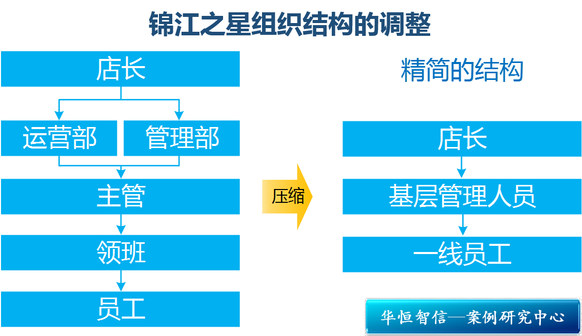 公司的职能部门开始考虑从根本制度上解决这些难题,组织结构的调整势在必行。以前的锦江之星在管理上依然存在星级饭店的影子,每个酒店在店长下都分为运营部和管理部两个部门,部门下再分为主管、领班、员工等等,一共有五六个级别。公司通过测算,看到这种模式超出了酒店业0.3的人房比例,显然这种结构不够精简,于是锦江之星将其压缩为三级,分别为店长、基层管理人员和一线员工。