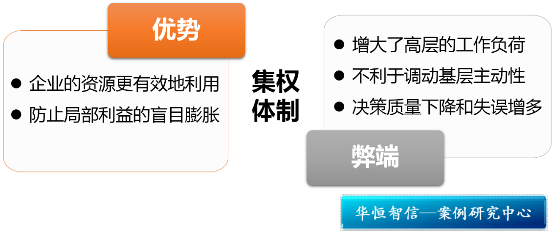 一般来说,在集权体制下,企业领导人能够全面控制整个组织的经营活动,统一指挥、集中领导,使企业的资源得到更有效的利用;此外,集权能够防止局部利益的盲目膨胀,确保组织价值观、政策和行动的一致性。然而,集权大大增大了高层的工作负荷,又不利于调动下层人员的主动性,影响未来管理人才的培养;另外还使得决策主观性增强,决策质量下降和失误增多难以避免。