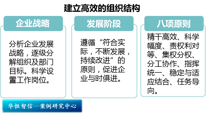 海尔实行“倒三角”的组织结构,综合内外驱动力使其不断运转,实现了企业的快速发展。它的成功实践为其他企业树立了榜样,但是,“倒三角”并不是企业组织结构的唯一正确选择。那么,如何建立科学的组织结构呢?华恒智信一直致力于这方面的研究,顾问老师提出以下建议: