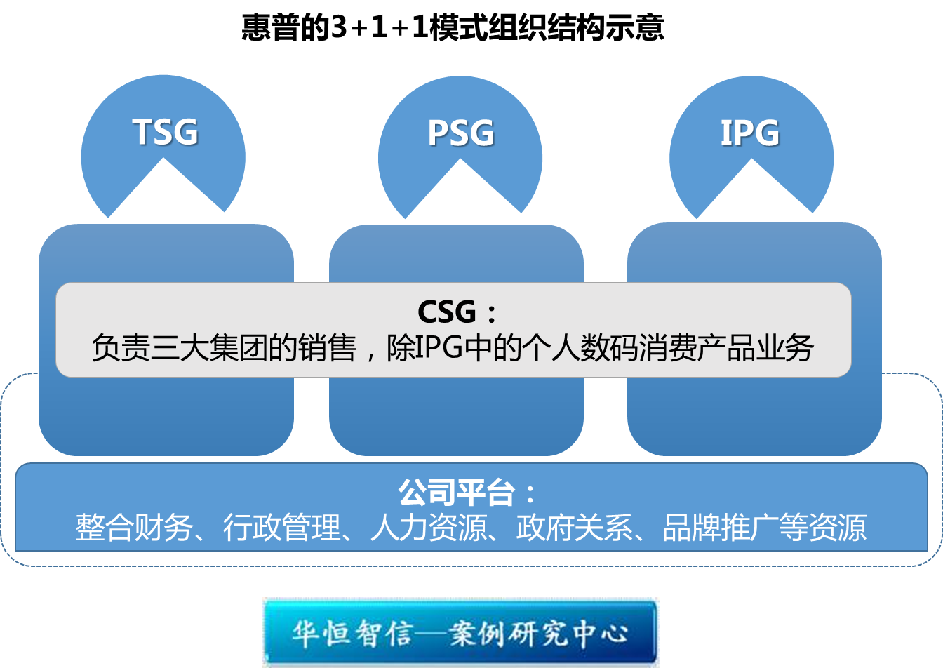 2002年,成功并购康柏之后,惠普整合两家公司的产品线,建立了基于当时四大主要产品市场的“4+1”的组织架构:企业系统集团(ESG)、信息产品集团(PSG)、打印及成像系统集团(IPG)、专业及支持服务集团(HPS),一个平台做的事情是为4大集团提供支持——财务、行政管理、人力资源、政府关系、品牌推广等。