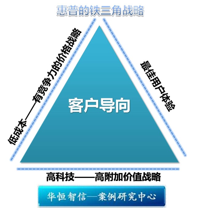 2002-2005年惠普经历了并购以及几次重大改组,但无论组织结构如何变动,惠普一直坚守着其“铁三角战略”:领先的科技、有竞争力的价格和最佳全面客户体验。