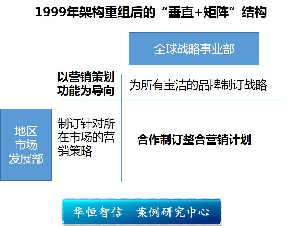 1999年,在宝洁当时的CEO贾格尔主导下,宝洁改变了原有的全球四大地域性机构矩阵式管理,将旗下所有产品按照品牌划分为五大品类,依此设立了五个全球战略事业部进行垂直混合管理,同时设立了八个地区市场发展部以及一个全球业务服务部。完成了宝洁全球组织架构史上最大的品牌垂直管理变动,付出高达19亿美元的重组变革费用。
