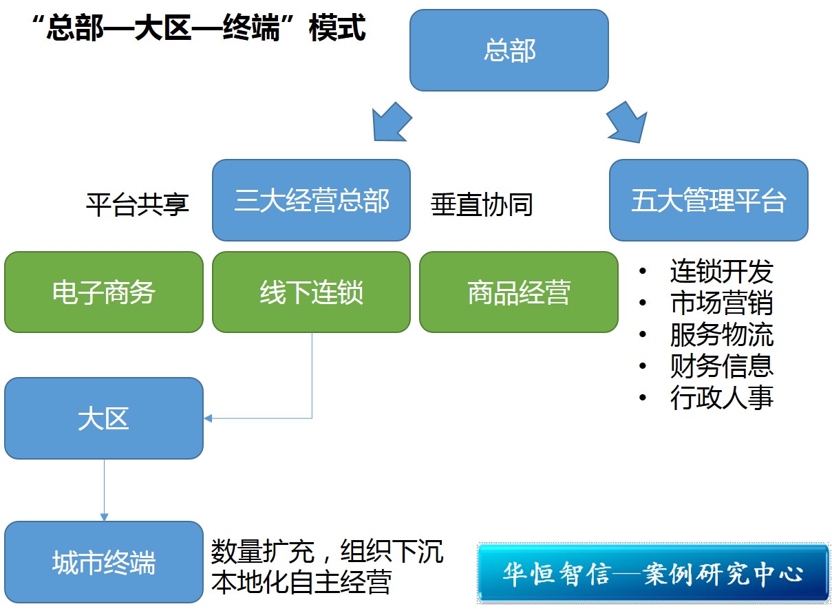 在总部管理层面设立了连锁开发、市场营销、服务物流、财务信息、行政人事五大管理总部,负责战略规划、标准制定、计划管控,协调各经营事业群工作。