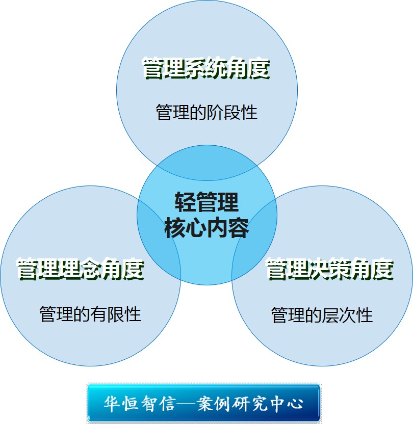 首先,轻管理是一种新的管理方式,它的核心内容从三个方面进行体现,一是管理理念角度,轻管理的核心内容是强调管理的有限性(管理的职能、技术、理论等)。二是管理决策角度,轻管理的核心内容是管理的层次性,该理论认为,由于企业的成熟度不同,管理层次也不同,找准管理层次,有助于实现准确、可控的科学管理。三是管理系统角度,轻管理的核心内容是管理的阶段性,在轻管理决策模型中表现为正梯形的管理系统模型。