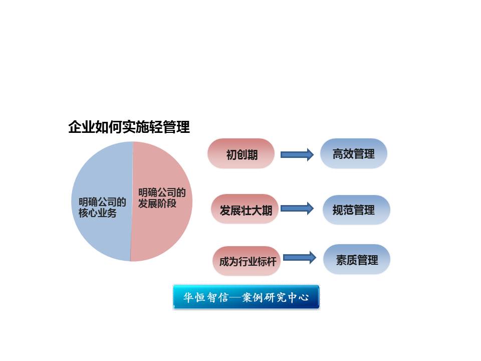 第二,明确公司的发展阶段。轻管理注重管理的层次性,不同层次适用不同的管理方法。企业的发展通常会经历初创期、发展壮大期、成为行业标杆三次层级阶段,在不同的时期公司在使用轻管理时也就需要不同的发展方式。初创期企业的各项内容还不是很完善,要的更多的是业绩,对管理的规范性要求较低,此时更适合用高效管理(以提高工作效率与效果为管理重点)的方式方法。发展壮大期,企业已经初步具备较成熟的管理体系,此时企业更适合规范的管理(以决策程序化、考核定量化、组织系统化为管理重点)方法。在企业成为了该行业的标杆企业时,企业需要更多的提升企业内部的员工素质、工作效率等,同时积极向国外的优秀企业学习。