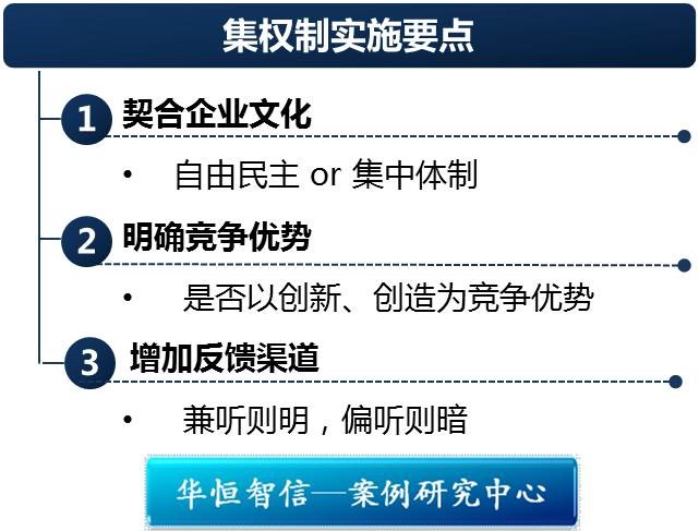 首先,契合企业文化。中国作为一个具有悠久中央集权制历史的国家,“集权制”思想早已深入人心,这种思想再次进入企业并为大多数领导者所采用就无可非议。员工对于这种“少数人统治”的企业文化也较为赞同。相比而言,那些以“自由发展”为组织文化的企业若采取“集权制”的组织模式,其结果就可想而知了。