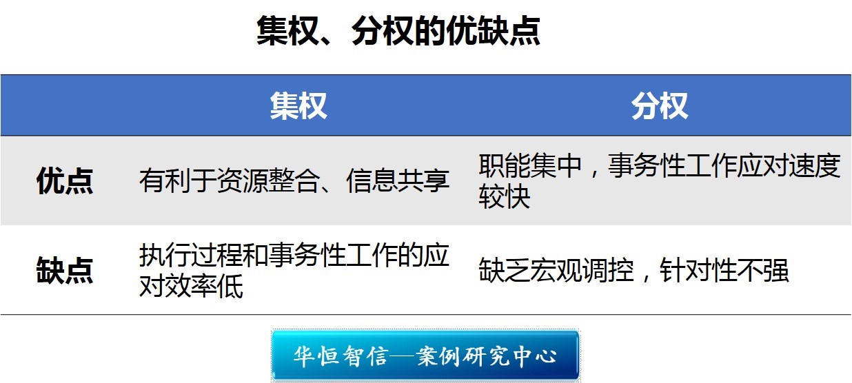 那么,一般企业该如何对待权力分配问题呢?华恒智信专家认为,在企业日常运作中,一般没有极端的集权或分权,关键在于根据自身和环境的特点寻求集权与分权的均衡点。分权管理的特点在于职能集中,事务性工作应对速度较快,但缺乏宏观调控,针对性不强;而集权管理有利于资源整合、信息共享,但执行过程和事务性工作的应对效率相对较低。