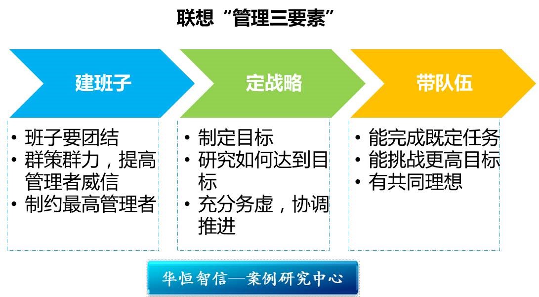 柳传志的管理思想被高度浓缩为“管理三要素”——“建班子、定战略、带队伍”。“建班子”是“定战略”和“带队伍”的先决条件,领导班子通过“定战略”正确决策,通过“带队伍”有力执行,实现企业的稳健发展。