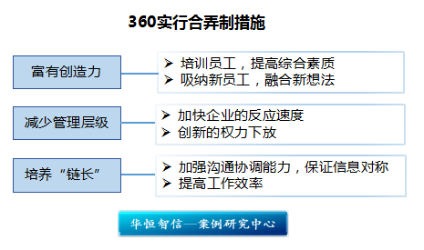 作为一家希望成为中国最大的IOT的互联网公司,我认为360应当更加尝试自组织管理模式,不再是老板、老员工带着新人工作,而应当像“合弄制”中提到的,不再是一位领导带领员工工作的关系,而是大家更像一群创业者,每个人都更富有创造力,及时应对市场的变化。