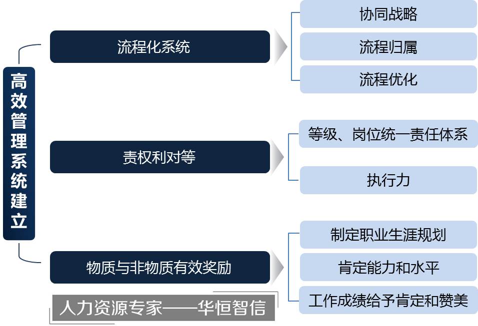 日本战略专家伊丹广之曾指出,“协同战略就是企业通过对隐性资源的使用获得协同效果的一种企业战略”。企业若想快速发展,建立流程化的管理体系才能支撑企业各单元业务的分工、运作,保证公司获得长期成功和永续经营。企业在进行流程化管理时,应当注意确认好流程归属,明细流程中具体包含的项目及项目主要的参与部门和人员。同时要重视流程的优化,尽量让不同利益相关者参与流程优化工作,以明确每个员工的工作职责和岗位角色。