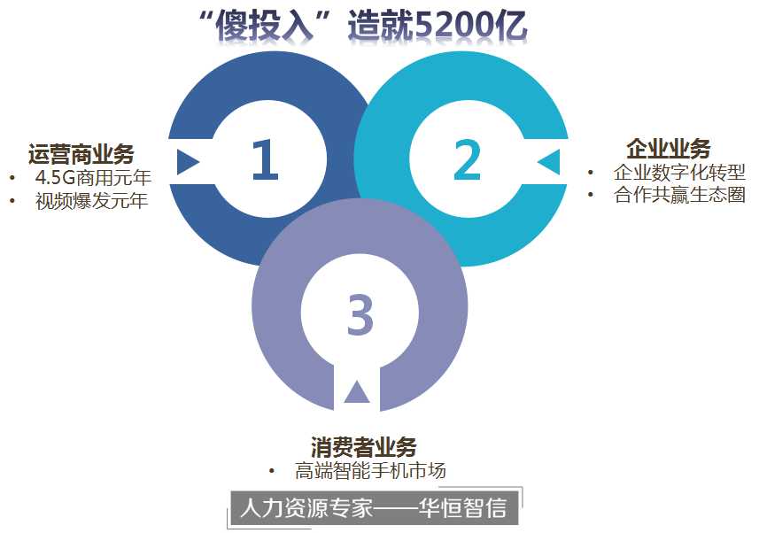 2016年,运营商业务、企业业务以及消费者业务三大板块共同支持了华为5200亿销售收入。