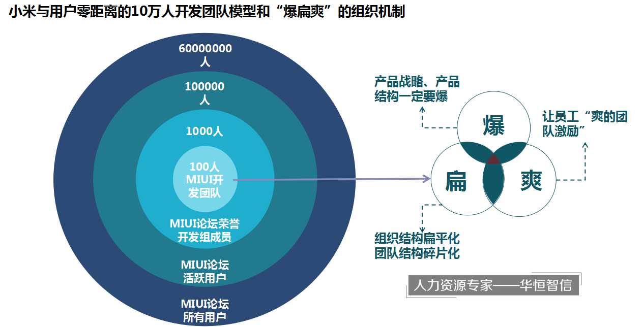 在《参与感》的三三法则当中,小米提出了明确的三个战略:“做爆品”“做粉丝”“做自媒体”。基于此,小米构建了它与用户保持零距离的一个扁平化的组织架构:以小米的核心的合伙人的团队,作为最高的一级管理层次,其中包括小米生态体系核心团队、硬件和BSP体系团队、MIUI团队等管理团队。这样一个团队,下面直接对的,就是一些核心的中层部门经理,那么再由中层带着几个直接的员工,构成了这样的一个由合伙人,中层到员工的三层扁平化的组织结构。在整个爆扁爽的体系当中,让员工与用户充分接触,才铸就了小米如此辉煌的业绩。