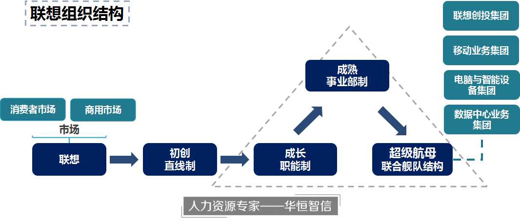 与很多公司一样,联想希望能够大小通吃,既做好消费者市场,又出击商用市场。前者是以渠道为核心的交易型业务,后者则是以大客户为对象的关系型业务。联想在其成长过程中经历了多次改革,从初创时期的直线制组织结构到成长期的职能制结构,再到成熟期的事业部制组织结构。而在2016年,联想的业务又被重新组合成联想创投集团、移动业务集团、个人电脑与智能设备集团及数据中心业务集团。联想此次调整,是其三驾马车:PC、移动、企业级这三大业务的重新梳理,而创投集团更是让人眼前一亮。从这次调整可以看出来,联想加大了移动和企业级相关业务的力度。正式因为这种“超级航母联合舰队结构”,才能让联想充分发挥在供应链资源方面的优势