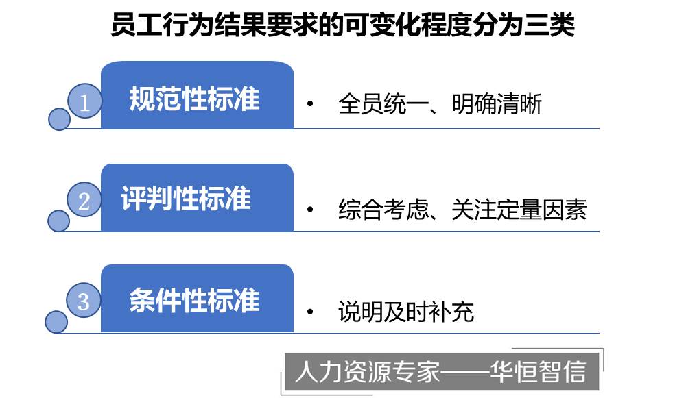企业的建立、运营、维护、发展都离不开一套系统化的制度来进行规范,只有具备一套完善的企业标准,管理者对员工的控制才能有据可依。因此,华恒智信认为,企业中不适当的管理控制源于管理制度的非系统化,那么企业应该如何制定自己的系统化标准,避免不适当的管理控制对企业发展产生负面影响呢?按照对员工行为结果的要求的可变化程度将标准分为三类:规范性标准、评判性标准和条件性标准,华恒智信建议针对企业中不同的情况分别对员工行为制定要求进行管控。