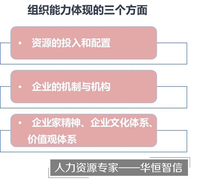 所以无论大小企业,要坚持持续进行组织能力的提升,要坚持抓企业内部的资源再配置、企业机制与结构的转型。组织能力无非体现在三个方面:一是资源投入和配置,二是企业的机制与结构,三是企业家精神与企业文化体系、价值观体系,这是构建组织能力三个最基本的要素。对中国企业来讲,企业资源投入和配置就是加大对人才、技术、品牌、信息、知识这些软性要素的投入,组织机制主要是优化治理体系,变革管理体制,提升组织运行机制,进行机制创新。
