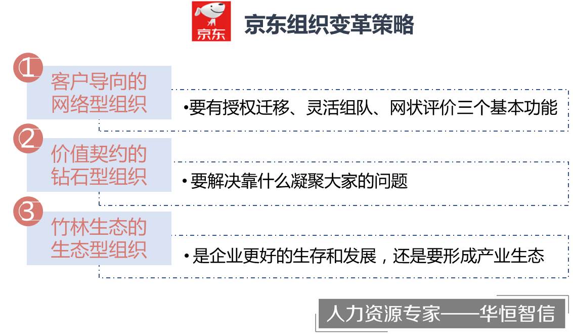 最近京东提出三大组织变革策略,要建立起客户导向的网络型组织、价值契约的钻石型组织、竹林生态的生态型组织。