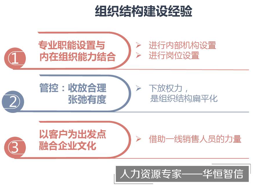 华为、苏宁、京东、美的虽然选择了不同的组织管理模式,但是有共同的特点,即:都是一种长远的发展模式,不仅照顾了企业的眼前利益,还考虑了企业的长期发展。其核心和共同目标是:盘活组织,提高人才能力。我们可以从这四家企业身上学到建设组织结构与管控模式的几点经验。