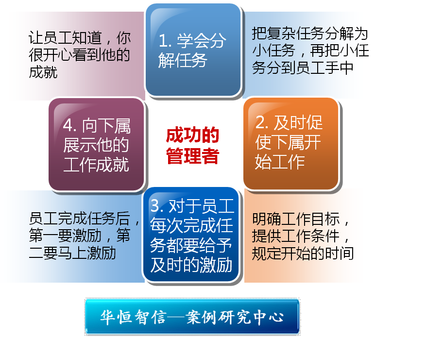 第二、我们要及时促使下属开始工作。例如,给他明确工作目标,提供工作条件,规定开始的时间。在下属对任务充满热情的时候就让他开始工作。