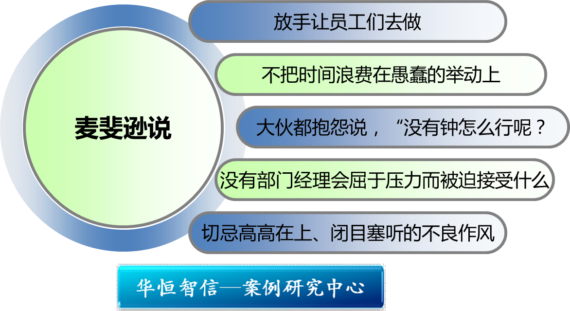 4、制定各种对设想、建议和艰苦工作加以鼓励的计划,设立奖金制度。 麦斐逊很快就把公司的领导班子从500人裁减到100人,机构层次也从11个减到5个。