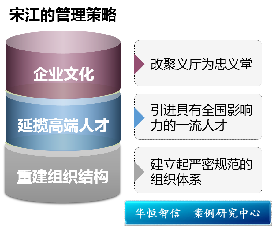 宋江成为一把手后的动作,一是企业文化,改聚义厅为忠义堂;二是延揽高端人才,引进具有全国影响力的一流人才;三是重建组织结构,建立起严密规范的组织体系;另外一个没有直接说出来的则是前面提到战略方向调整。而实际上,战略调整之下其它三项都已经成为手段。