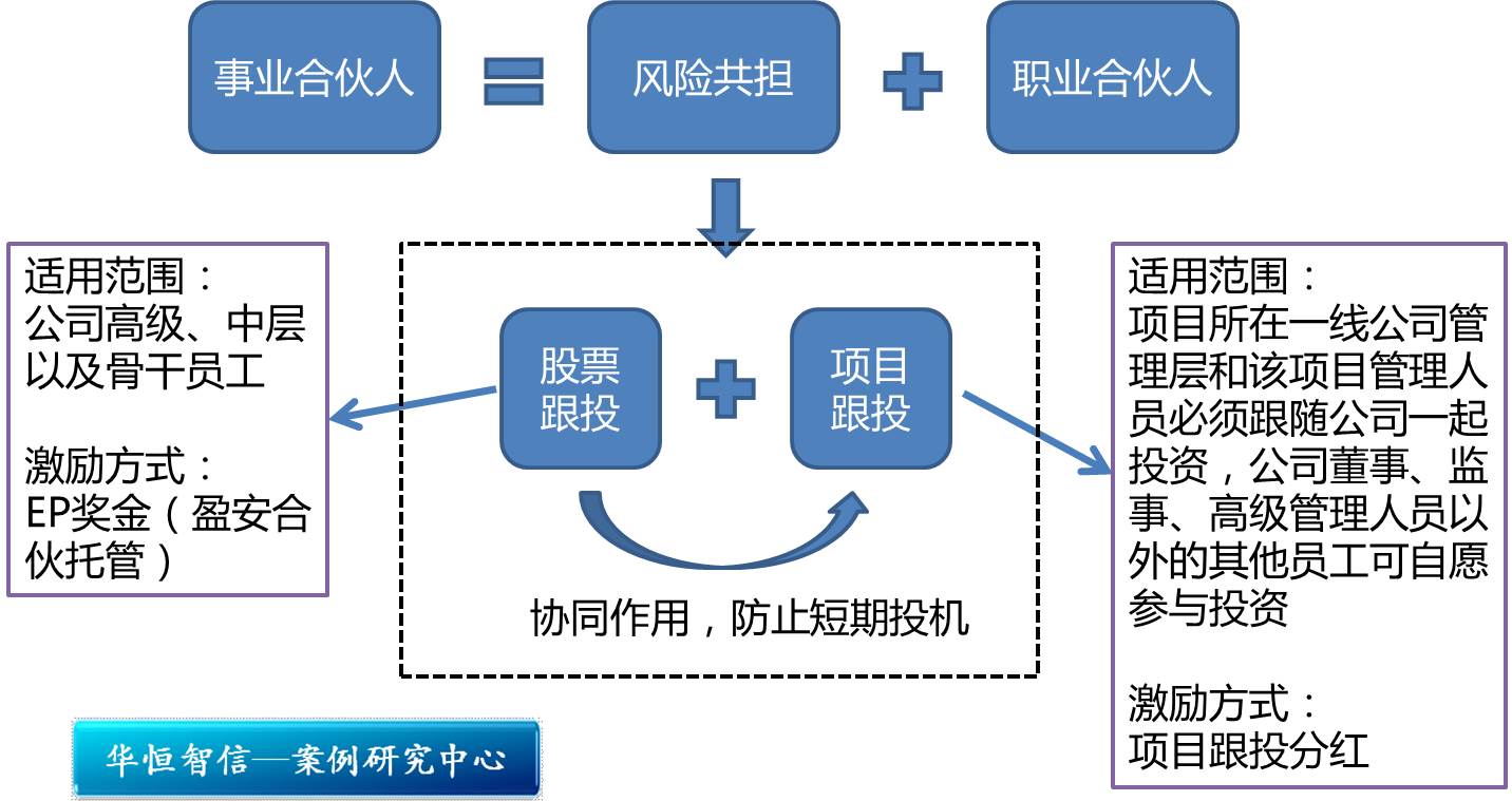 所谓“跟投”是对你所做项目和所在公司,用自己的真金白银投下去,给出一个“愿意捆绑在一起”的承诺。利益有了捆绑,在新机制驱动下,就有可能打破原来的职业经理人的科层化、责权化和专业化的窠臼。从金字塔式的组织机构转变为扁平化结构。合伙人享受工作收益(薪资)、项目收益(项目跟投分红)和股权收益(股票分红)。