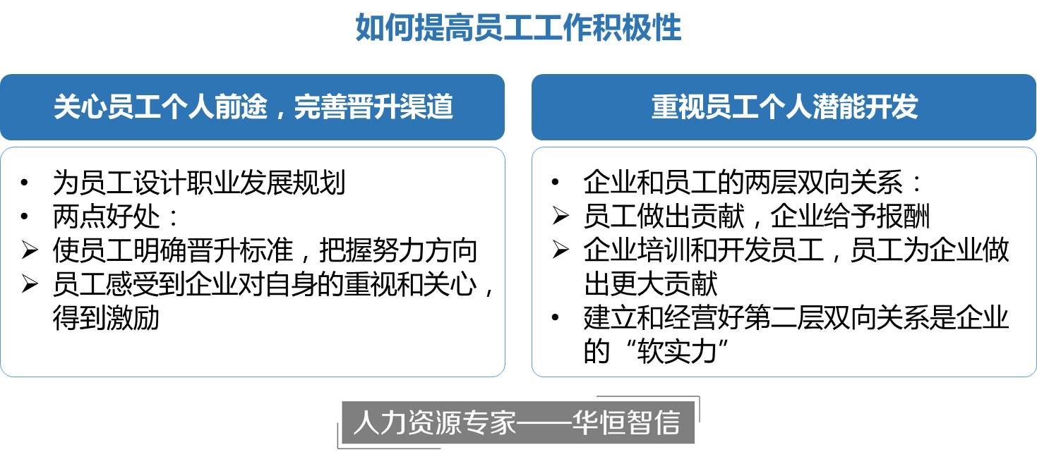 第二,重视员工个人潜能开发。员工到企业里面工作,其实是和企业间建立起了双向关系:第一个层次的双向关系是,员工为企业作出自己的贡献,企业给予员工相应的报酬(主要是金钱上的);而第二个层次的双向关系是,企业让员工能够学到什么,素质、能力等各方面得到提升,进而员工可以为企业作出更多的、更有价值的贡献。在现实中,对于企业想提高员工的稳定性和积极性而言,第一个层次的双向关系容易得到重视,而第二个层次的双向关系往往容易被忽视。华恒智信认为,建立和经营好第二个层次的双向关系能够成为企业的“软实力”,企业应该注重对员工的培养,通过培训、轮岗等方式,加深员工对自身的认识,提高员工的工作能力。这样一来,员工就能在企业中找到归属感、成就感,越发有干劲儿,工作积极性得到提高,同时也不会轻易离开企业。