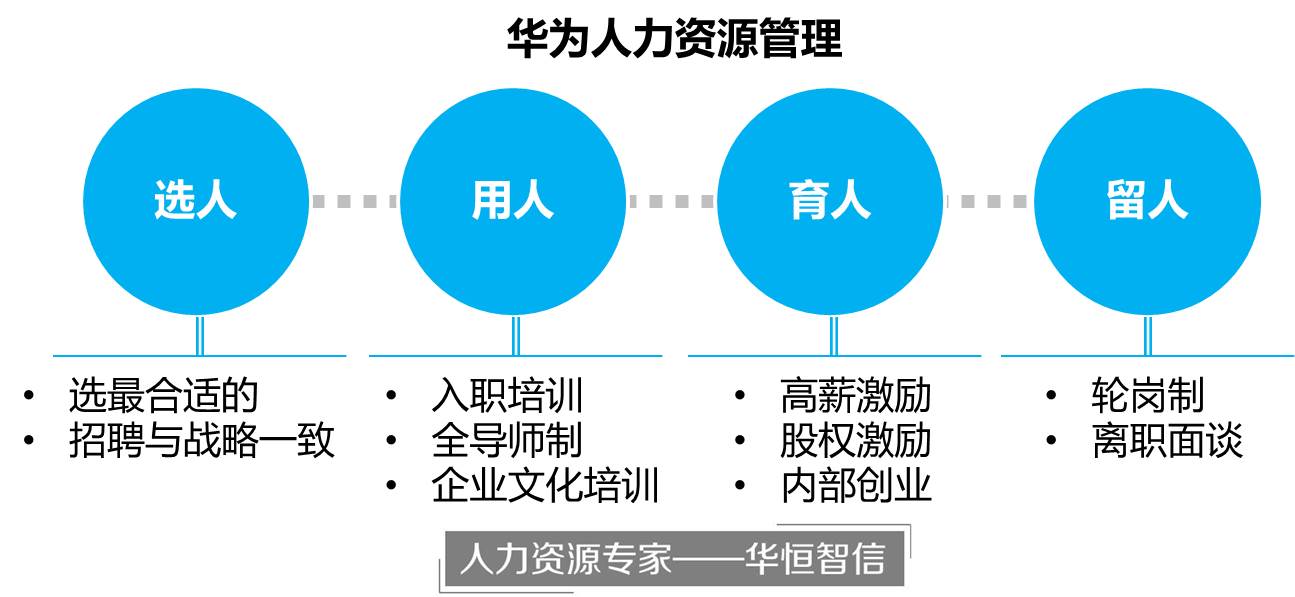 华为作为中国民营企业的成功范例,在人力资源管理方面存在很多属于自己的成功之处,在人力资源管理的选、用、育、留方面有很多值得借鉴之处。华恒智信人力资源专家指出,企业借鉴华为公司的人力资源管理模式时可以学习以下几点: