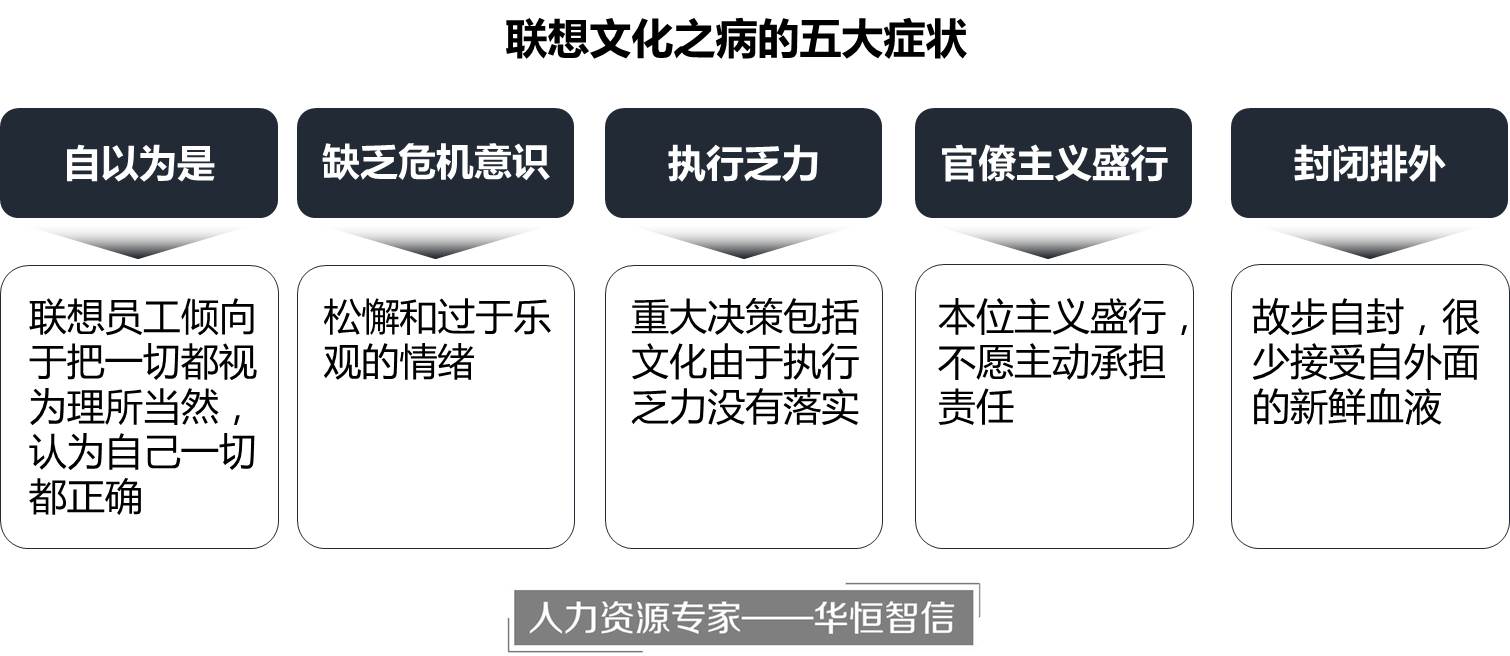 这是一种对联想未来危害最大的文化。它使相当多的联想员工倾向于把一切都视为理所当然,认为自己无所不能,自己的一切都是正确的,而对外界的变化充耳不闻,容易养成自我感觉良好的习惯,对不同的观点不屑一顾,还会对客户、对合作伙伴产生怠慢心理和行为。它最为致命的是,即便问题真的出现,它也会心存侥幸,或者干脆就不承认失败或出错。