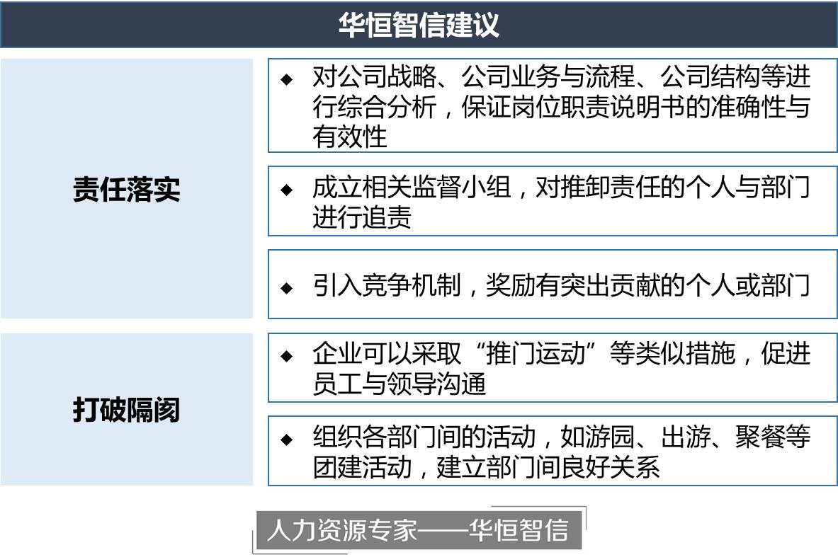 责任划分是各部门、各岗位责任落实的重要前提。岗位职责说明书是责任划分的重要工具,许多企业都建立了岗位职责说明书,但是在实践后却发现说明书中的内容并不完善,往往仍存在职责重叠、忙闲不均等问题。我们认为,企业在对部门职责进行列举和归类时,需对公司战略、公司业务与流程、公司结构等进行综合分析,重点考虑人员配置是否合理、职责是否重叠、责任是否细化、职责连接是否顺利、忙闲是否均等问题,从而保证岗位职责说明书的准确性与有效性,促进各职位与部门落实自身职责,最大限度地发挥组织效力。
