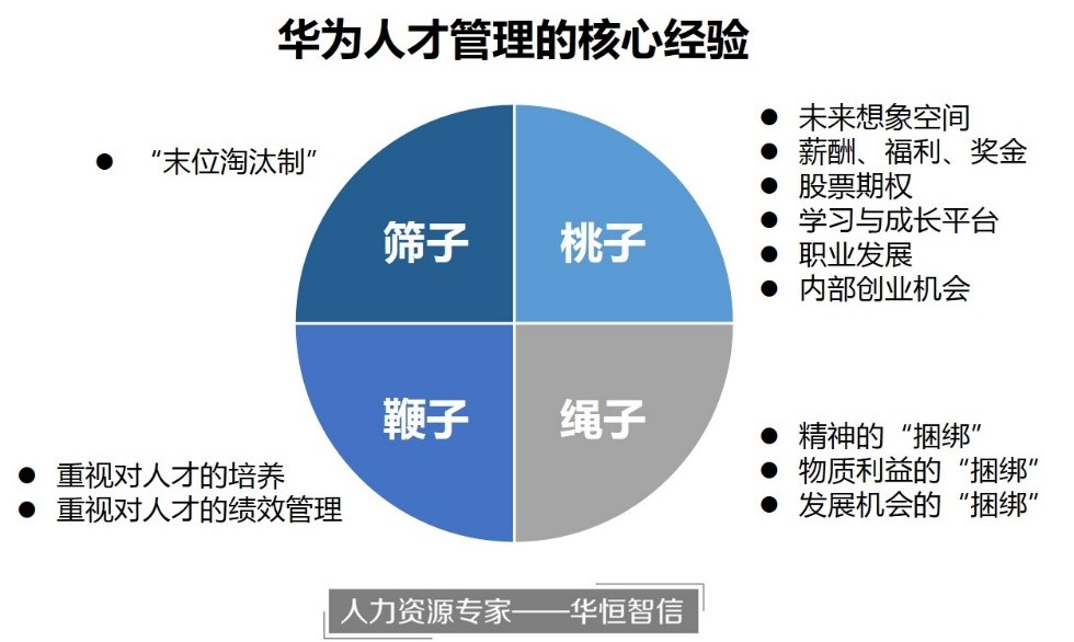 华为针对上述四个方面的问题所采取的人才管理策略,我将其形象地比喻为“桃子”、“绳子”、“鞭子”和“筛子”: