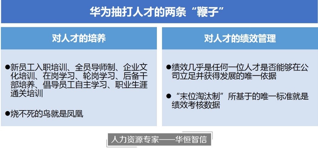 华为是一家极善于严酷地运用“鞭子”来“抽打”人才的企业。“抽打”人才的目的有两个,一是让人才不断学习进步,二是让人才为企业创造更好的业绩;前者是迫使人才有工作意愿和工作能力,后者是迫使人才为企业(也是为人才自身)创造价值。
