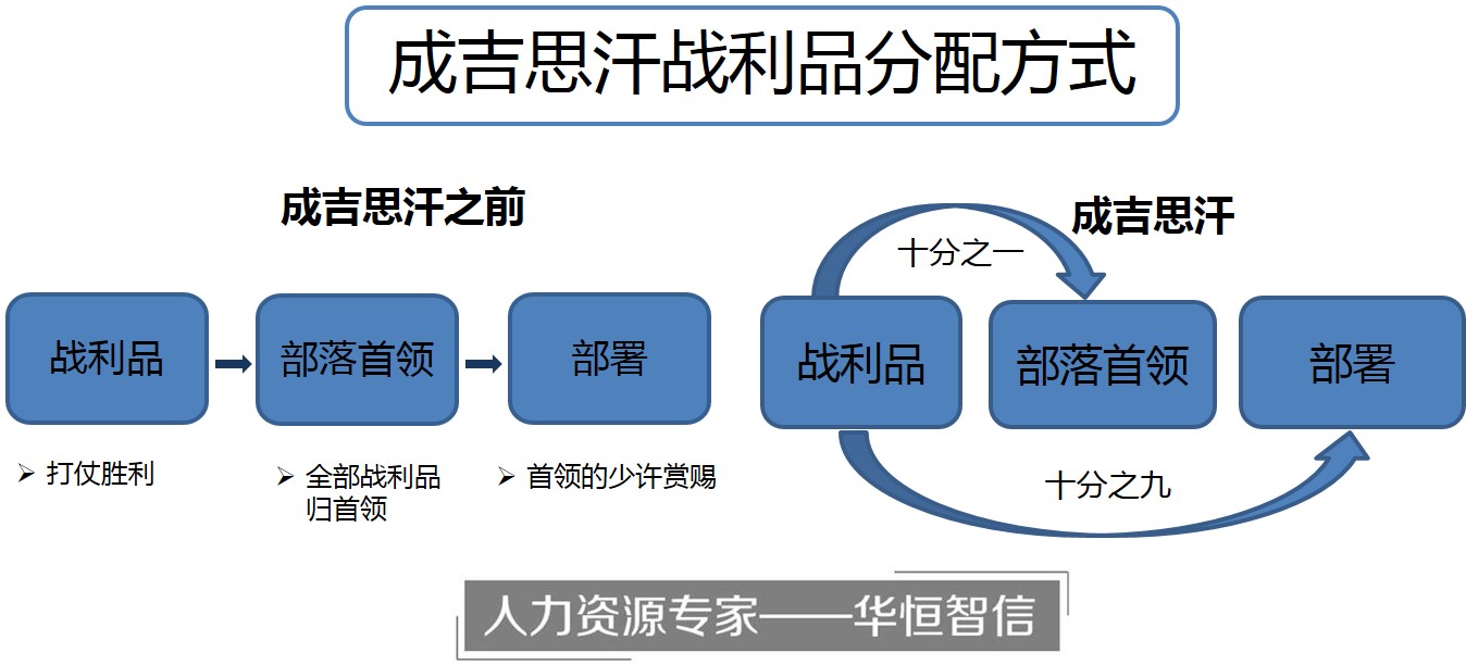 在成吉思汗之前的蒙古草原,部落战争的战利品都是全部归于部落首领的,这一点很独裁,无法调动全体员工的工作热情。员工们若想获取战利品,只能祈求首领的赏赐,而且这些赏析还很少。所以,有了成吉思汗改革。成吉思汗上任后,把生产方式的分配制度予以改革,重点加大员工的直接获取战利品力度,旨在激励员工的工作热情。所以,他个人仅从战利品中拿百分之十的内容,其余皆归下级部署。这样,一种独裁的专有制度被改革成了领导与员工共同持有股份内容的分配方式,这极大地促进了部族的凝聚力和战斗力,因为每个人不仅是为公司奋斗,更是直接为个人奋斗。
