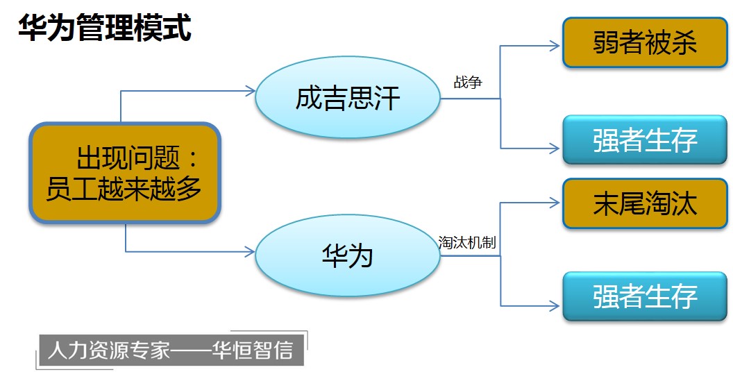 成吉思汗不存在这个问题的原因是战争是最好的退出和淘汰机制,战斗力弱的人在战争中都会被杀、被俘、受伤、病死等等淘汰和退出机制。那么华为毕竟不是去打仗,如果没有好的退出和淘汰机制,队伍越来越大,人越来越多,如何保证激励性,如何保证公平性,这些都是巨大的问题。所以华为管理模式中退出和淘汰机制是必选项。