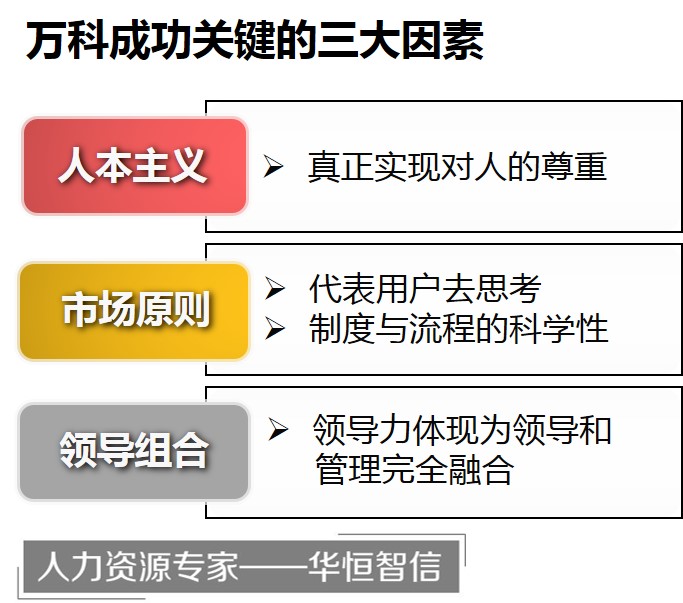 王石摧毁了一个人思考的老板文化,但却建立了所有人思考的企业文化。事实上,在中国企业中,企业文化往往是老板文化,但是如何建立符合企业发展的老板文化、如何把老板文化成功地进行沉淀,是困扰企业的一大问题。万科成功的关键因素是其企业文化中的人本主义和市场原则,十分有借鉴和实操意义。从万科的成功案例中,结合多年实际经验,华恒智信提出以下建议: