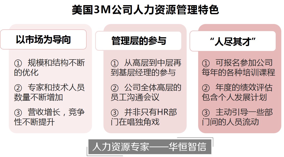 3M公司作为典型的创新导向型企业,其人力资源管理策略充分与其对于创新型技术人才不断更新的需求紧密结合,正因为如此,才能够在市场竞争越来越激烈的当下,仍然强悍地占据着市场前沿地位。