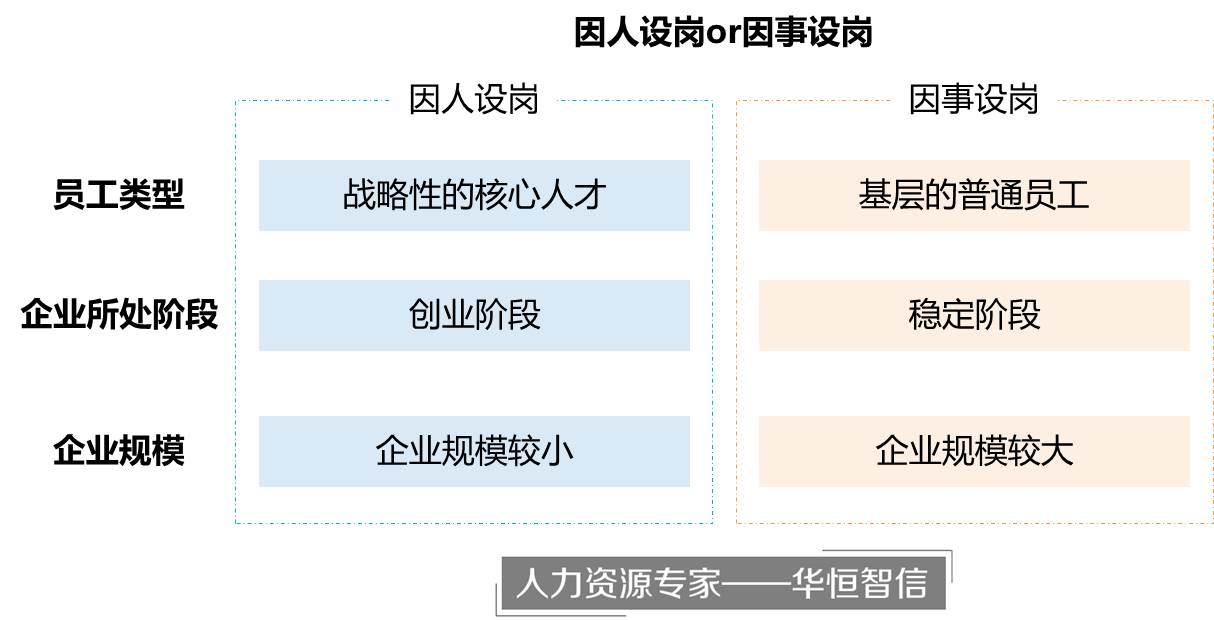 传统的因事设岗和现代管理观念中的因人设岗各有优缺点。因事设岗可操作性更强,更能体现内部公平;因人设岗有利于组织激励核心人才,但也会带来人员过多的成本增加。那么,企业在进行职位设置和人员配置时更应该遵循哪项原则呢?华恒智信认为,因事设岗与因人设岗并不矛盾,企业在运用的过程中应考虑以下三个要素。