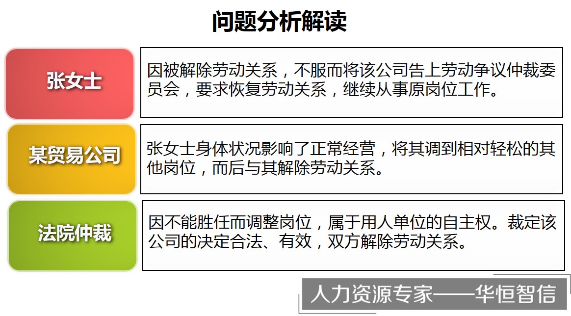 劳动争议仲裁庭经调查认为,该公司相关规章制度明确规定,张女士的身体状况无法履行相应的岗位职责情况,视为不能胜任工作。因劳动者不能胜任工作而变更、调整职工工作岗位,则属于用人单位的自主权。因此驳回张女士的申请,裁定该贸易公司的解除决定合法、有效,双方解除劳动关系。