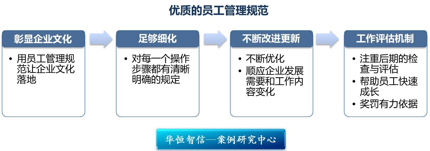 7-11作为日本零售业巨头,世界上最大的连锁便利店集团,在店员管理问题上有非常具体、可操作的员工管理规范。从制定详细的工作计划表,到细化任务要求到每一个操作步骤,再到事后对工作的具体检查评估方式,7-11的做法旨在让店员不仅仅从事单一的商品售卖活动,还能够胜任各种店铺经营管理活动。华恒智信专家指出,7-11这种管理员工的思路很值得肯定,但是,落实到具体的员工管理规范上,并不一定适用于每一个企业,这需要对行业类型、企业文化等方面做具体的分析后,制定出一套适合自身的员工管理规范。一套优质的员工管理规范有哪些标准,华恒智信给出以下几点建议: