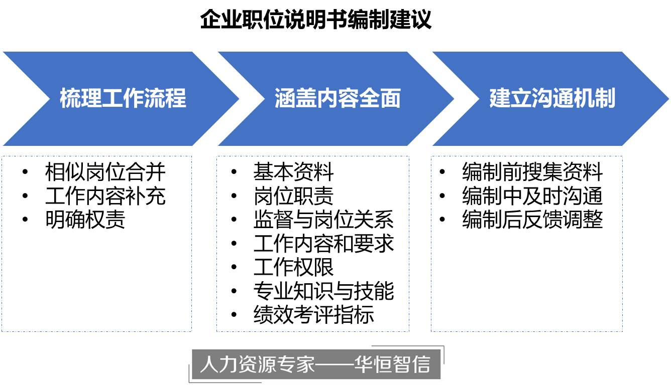 职位说明书的缺失致使Z公司员工权责不清、授权不充分,并最终导致了员工满意度降低,员工离职的严重后果。作为最基础的工作,岗位说明书对企业的定岗定编,员工选拔与晋升,员工考核与培训,工作流程的标准化等工作至关重要。华恒智信专家根据多年的行业经验,对企业职位说明书的编制工作提出以下三点建议。