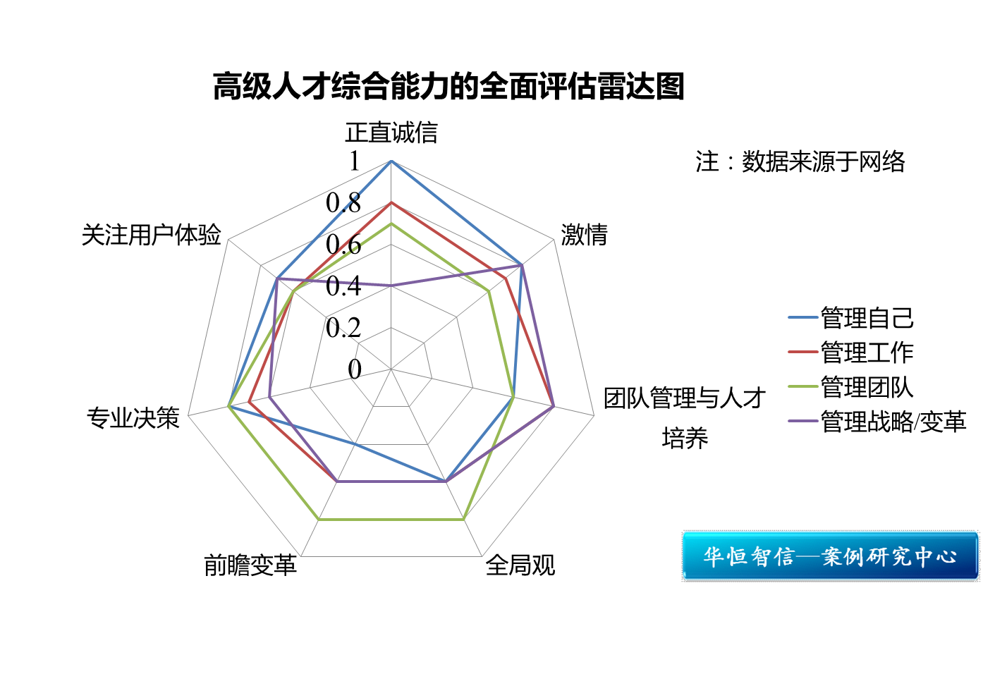 如同做微信的用户体验,腾讯对高级人才的能力评估,执行使用最简单有效工具的思路,雷达图因此被用于综合能力的考评。“坦率来说,腾讯不是一个追求标新立异的公司。人力资源方面,腾讯的优势在于,我们持续稳定地执行我们认可的考评思路。每年进行机制优化后,我们会运用一些基本的比较简单科学的工具,来使项目做得越来越好。”陈双华表示。