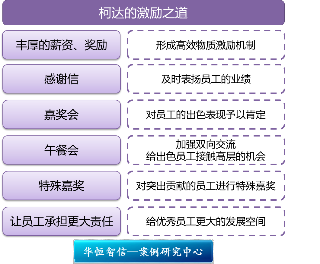 柯达为员工提供富有竞争力的薪资,并根据员工的业绩表现灵活地进行调整;各种福利、奖励一应俱全,一起构成柯达对员工的高效物质激励机制。