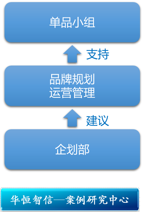 其一,按照规模和成长性划分,集团总经办下设两个组,品牌规划组与运营管理组。品牌规划组的定位在于帮助品牌走完“从无到有”的过程,包括前期的市场调研、商标注册、知识产权保护,等等,从0到1000万元,这个阶段的品牌都由该组来协助解决各种各样的问题。运营管理组的功能则在于“从小到大”,过了1000万元以后,主要由该组提供支持。
