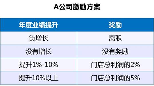 A公司面临的问题,在于在A公司的奖励制度下,店长努力工作提升门店业绩后可以拿到的奖励看似很多,实则不多。因为和A公司类似或者一样的门店数量非常多,单个门店能大幅度提高业绩的可能性不是很大,长此以往还是会引起店长积极性下降,从而导致门店业绩下降的局面。A公司采取的奖励制度存在着如下问题: