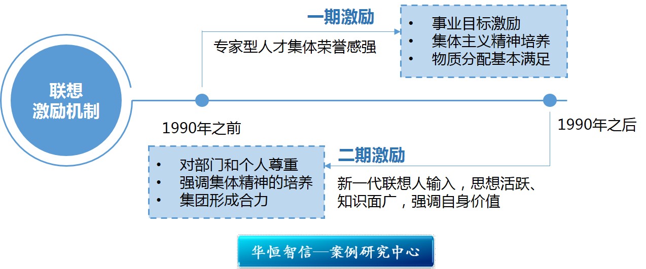 二期激励是指1990年之后,随着大批新一代联想人的输入,给集团的激励提出了新课题。新一代联想人在事业目标,用知识创造财富,把公司办成国际一流企业这一点上,同第一代联想人有着共同之处。但新一代联想人由于年轻,思想活跃,知识面广,易于接受新事物,虽然也承任集体作用,但不甘于向老一代联想人那样,默默无闻,他们更强调自身价值的实现。如果激励不好,他们可能会另谋高就。这一时期的激励,提高了对部门和个人尊重的份量。今天的联想,三四十岁的年轻人便能够运作几个亿的资金,经营着十几个亿营业额的市场,使他们越来越感到在联想这个大舞台,你有多大的本事都有用武之地。自身价值得以实现的满足感,使他们把联想作为建功立业之所。但成就感、物质满足解决后,集体主义精神的培养已是重中之重。回顾联想的历史,属于那种靠队伍团结发展起来的企业。今天,面对世界一流电脑企业,自身仍显单薄。这就使他们更看重队伍的团结,依靠集体的力量,确保自己立于不败之地。但新一代联想人那种强烈的实现自我的愿望,如果得不到同集体融合,整个集团将形同散沙。如果这时的激励只注重个人成就感的满足,而忽略集体精神的培养,集团形不成合力,与世界电脑巨头较量,将不堪一击,企业的发展将功亏一篑。鉴于此,对新一代员工的集体精神的培养,已是面临的最大的激励。他们注重了这点,从而使新一代联想人以企为家,献身事业。