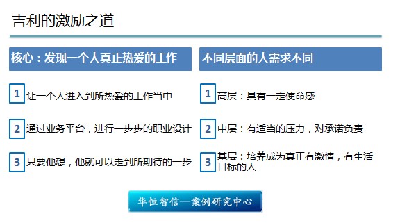 华恒智信认为通过借鉴吉利的案例,企业要想做到成功的员工管理与激励,主要是通过以下三个环节。