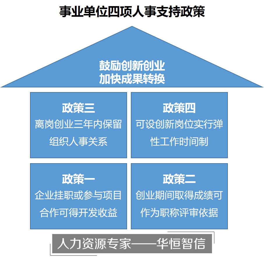 国家人社部出台了四项新的政策,从国家的角度来讲是为了支持“大众创业,万众创新”的“双创”政策,但对于广大事业单位的人才来说,却是又松了绑还给穿上了盔甲,使之能够更加放心大胆地投入到创新研究中,并促进创新成果的转化,这不论是对于国家还是对民众来说都是意义重大的。。华恒智信分析员认为,这项政策的本质上反映了人力资源地位的进一步上升,虽然它只适用于事业单位,但对于广大企业而言,“留职不停薪”的政策却很有借鉴意义,企业应当创新激励方式。