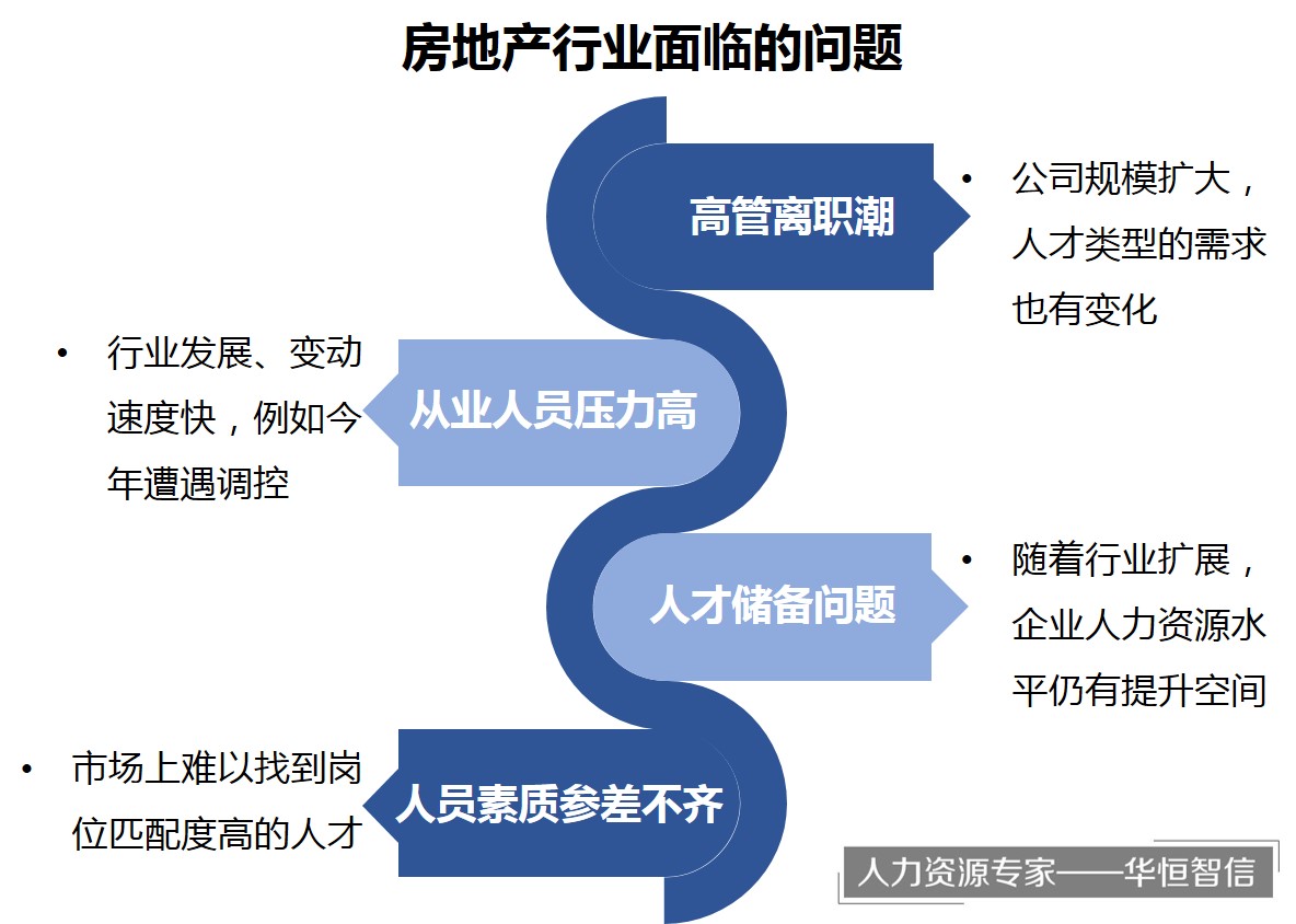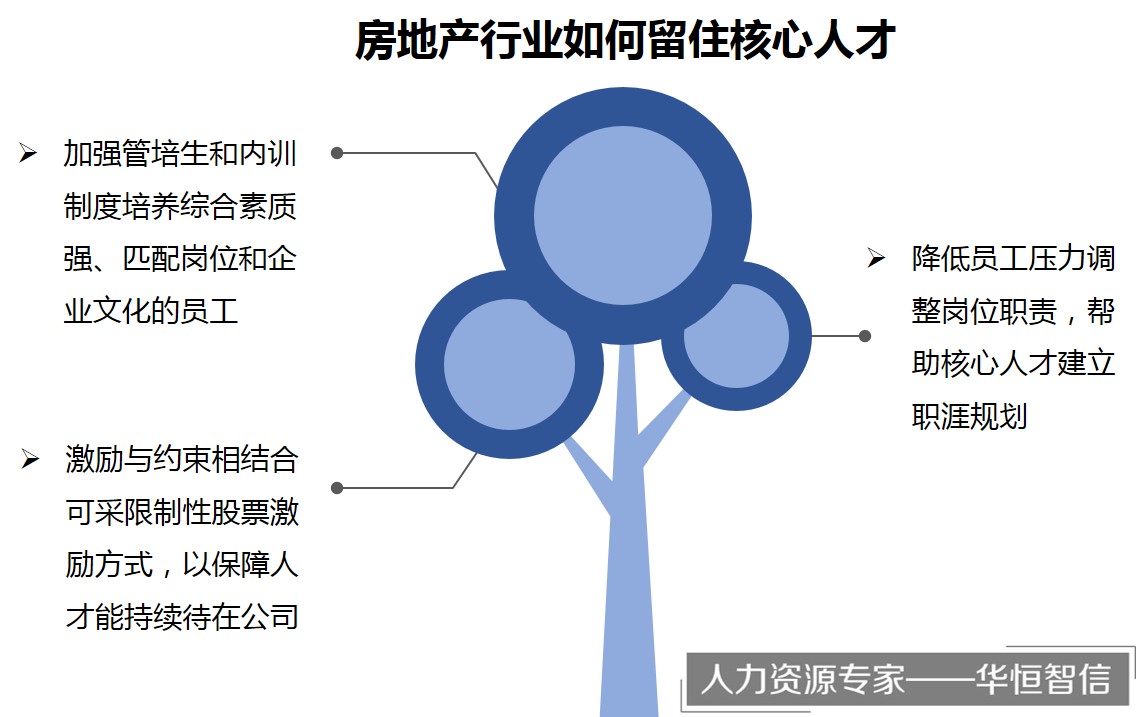 房地产行业近年来扩展迅速、利润持续增长,但同时面临着环境动荡、政府调控的风险,管理人员流动频繁、员工混日子现象严重也是长期困扰企业的问题,由于没有过大的压力,高层的精力又多放在了业务方面,管理松懈,企业内部的人力资源水平仍需提升。房地产企业要如何在内外部环境的双重压力下留住核心人才呢?华恒智信分析员结合多年的丰富的房地产行业人力资源咨询经验,提出以下分析,也希望对其他行业的企业有借鉴意义。