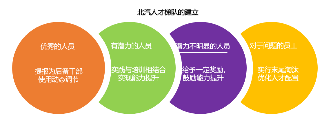 对于那些有潜能但缺乏工作经历的员工,北汽会进行一些岗位调整;对于那些在专业方面还需进一步提升的员工,集团会给他们提供相关技能培训;对于那些潜力不明显、能力还需加强的员工,集团会给予奖励,鼓励他们继续努力。北汽一方面帮助优秀员工制定职业生涯规划。另一方面,对于不能胜任岗位的员工严格实行末尾调岗。