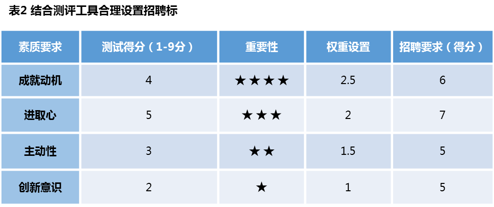 首先,可以通过权重设置体现不同素质的重要性程度。比如确定需要在招聘过程中着重考察应聘者的成就动机、进取心,同时参考其主动性和创新意识的表现,则可以在统计测试结果时将成就动机和进取心的权重设置为较高水平,而将主动性和创新意识的权重设置为较低水平,这样综合得分就能够体现出不同对不同素质项的差异性要求。