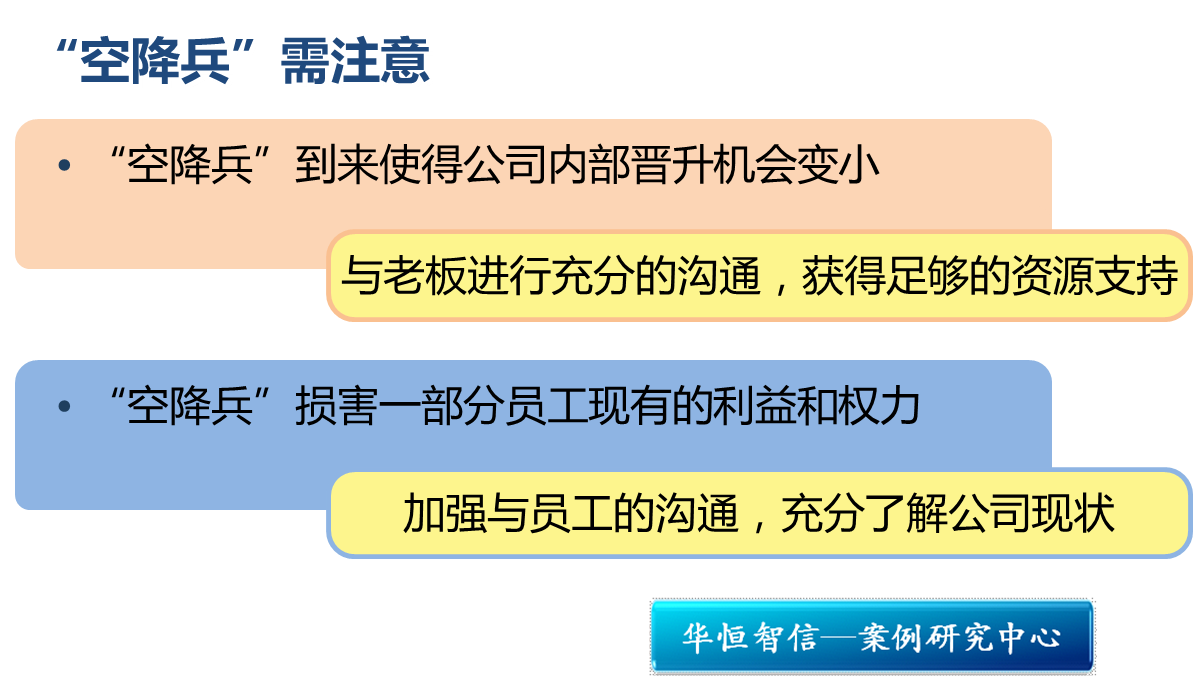 综上所述,“空降兵”在融入初期,一定不能急躁大意,缺乏准备工作。耐心和恒心是其工作必不可少的素质,而与老板和员工的沟通、对实际情况的考察与了解,则是“空降兵”站稳脚跟的基石。